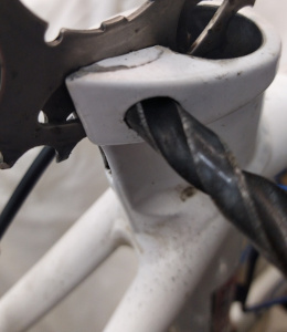 Drilling out the hole was simple enough. A couple of old sprockets stopped the drill from going too far or breaking the glue bond.