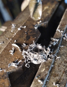 Drilling out the hole was simple enough. A couple of old sprockets stopped the drill from going too far or breaking the glue bond.